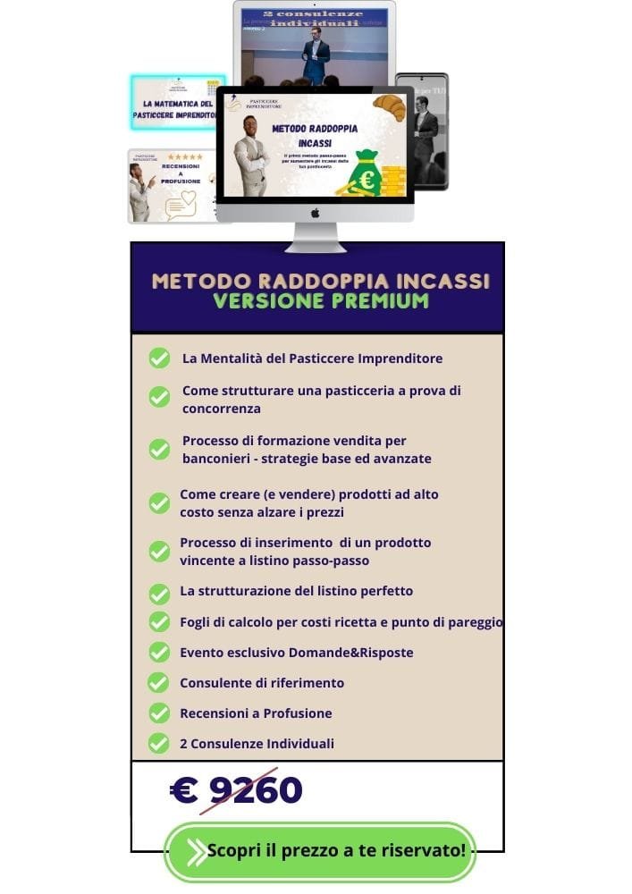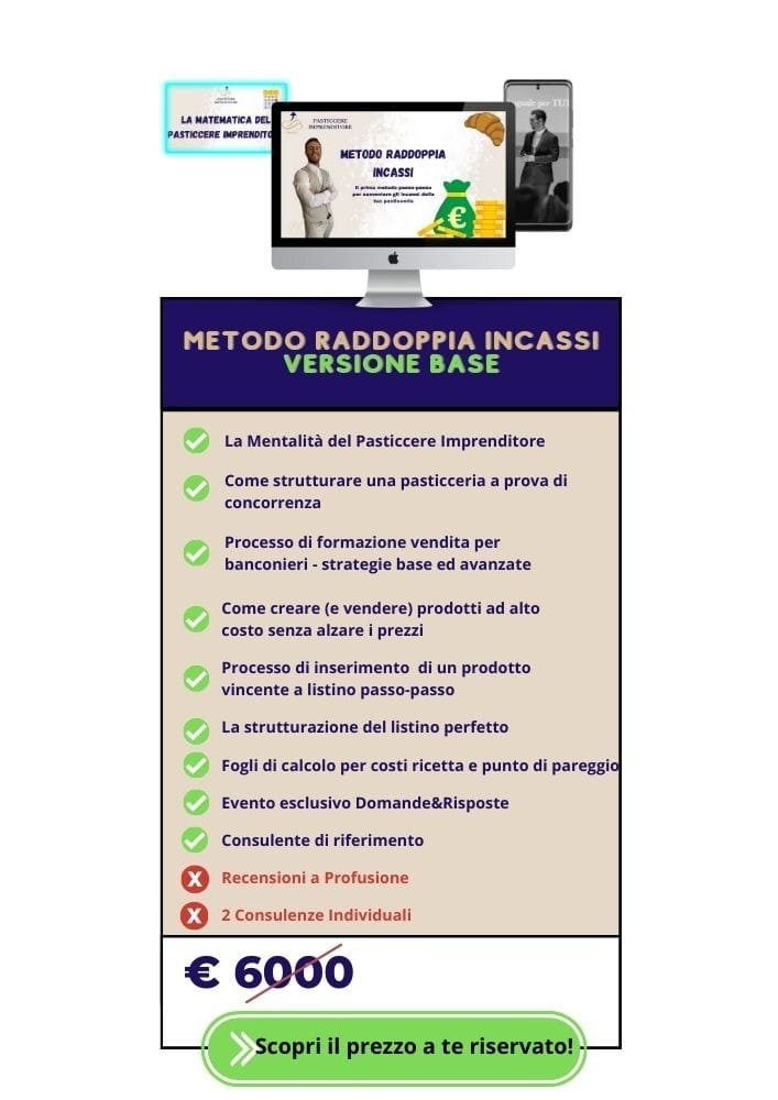 Posso dirti che il solo percorso Metodo Raddoppia Incassi ha portato i titolari di pasticceria che sto seguendo ad aumentare i loro fatturati di migliaia di euro ogni singolo mese. Considerando che si tratta di un acquisto una tantum che ti resterà per tutta la vita, se proprio dovessi quantificarlo direi come minimo 3000€.